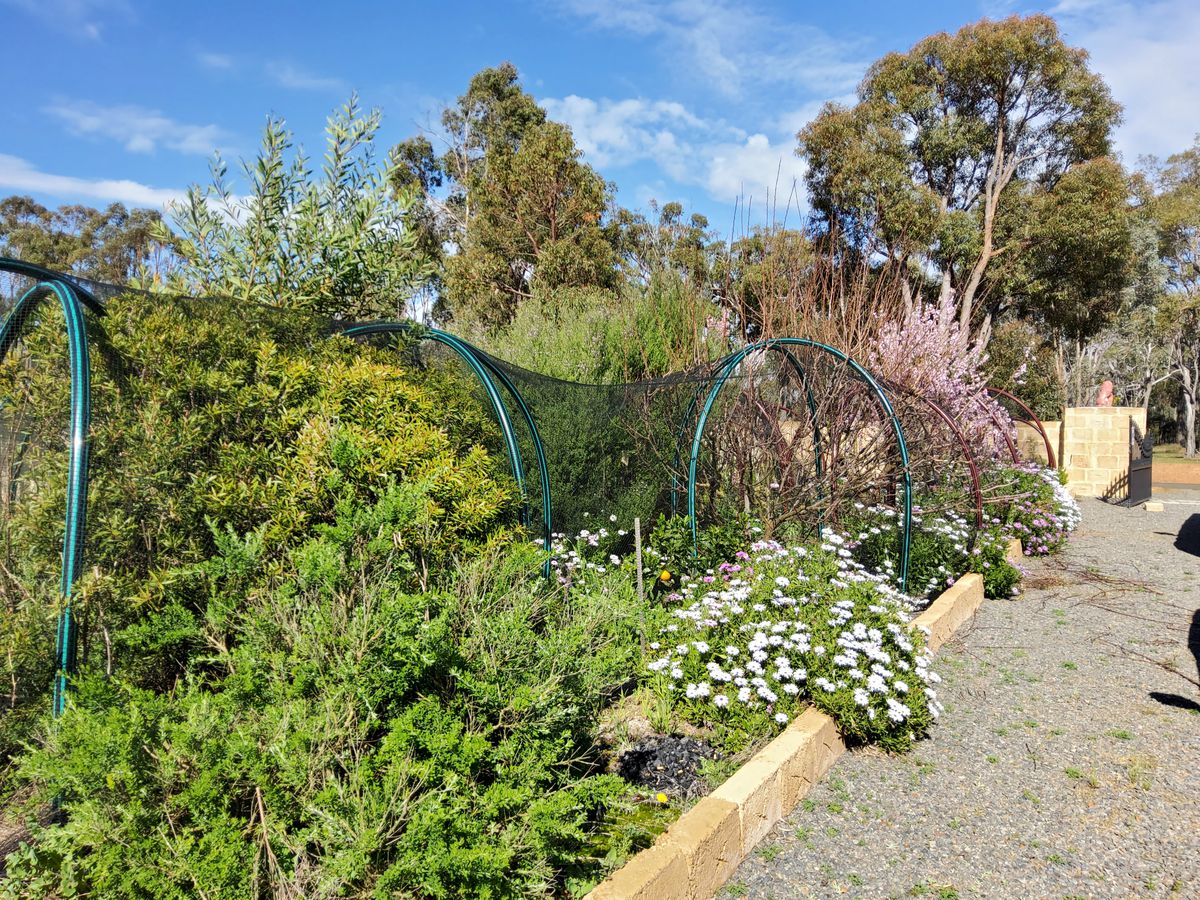 Established gardens with colourbond fencing with stone wall and wrought iron gates.