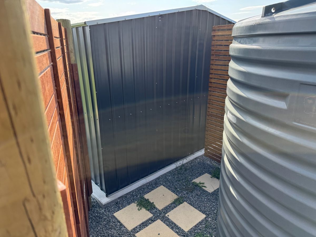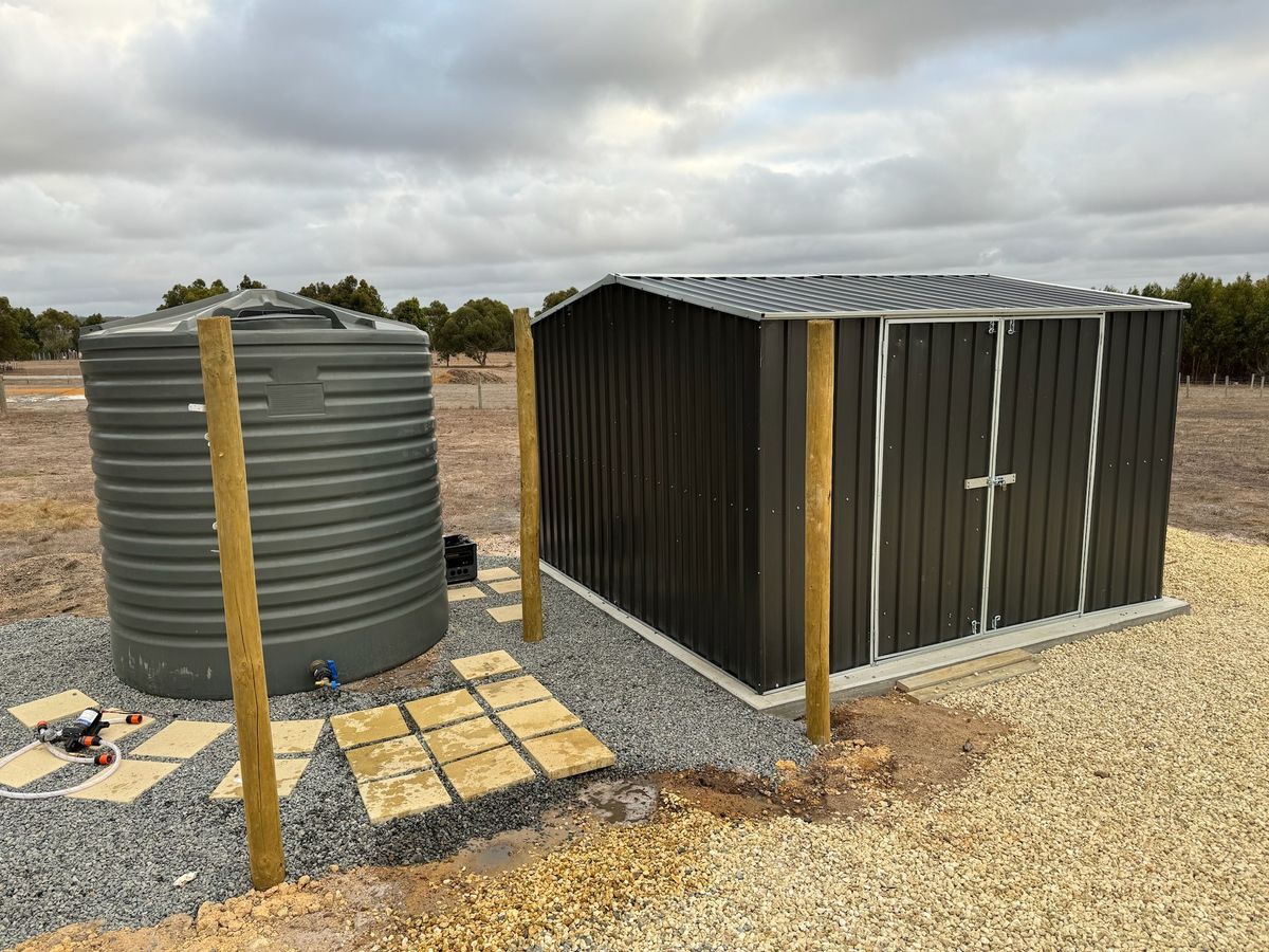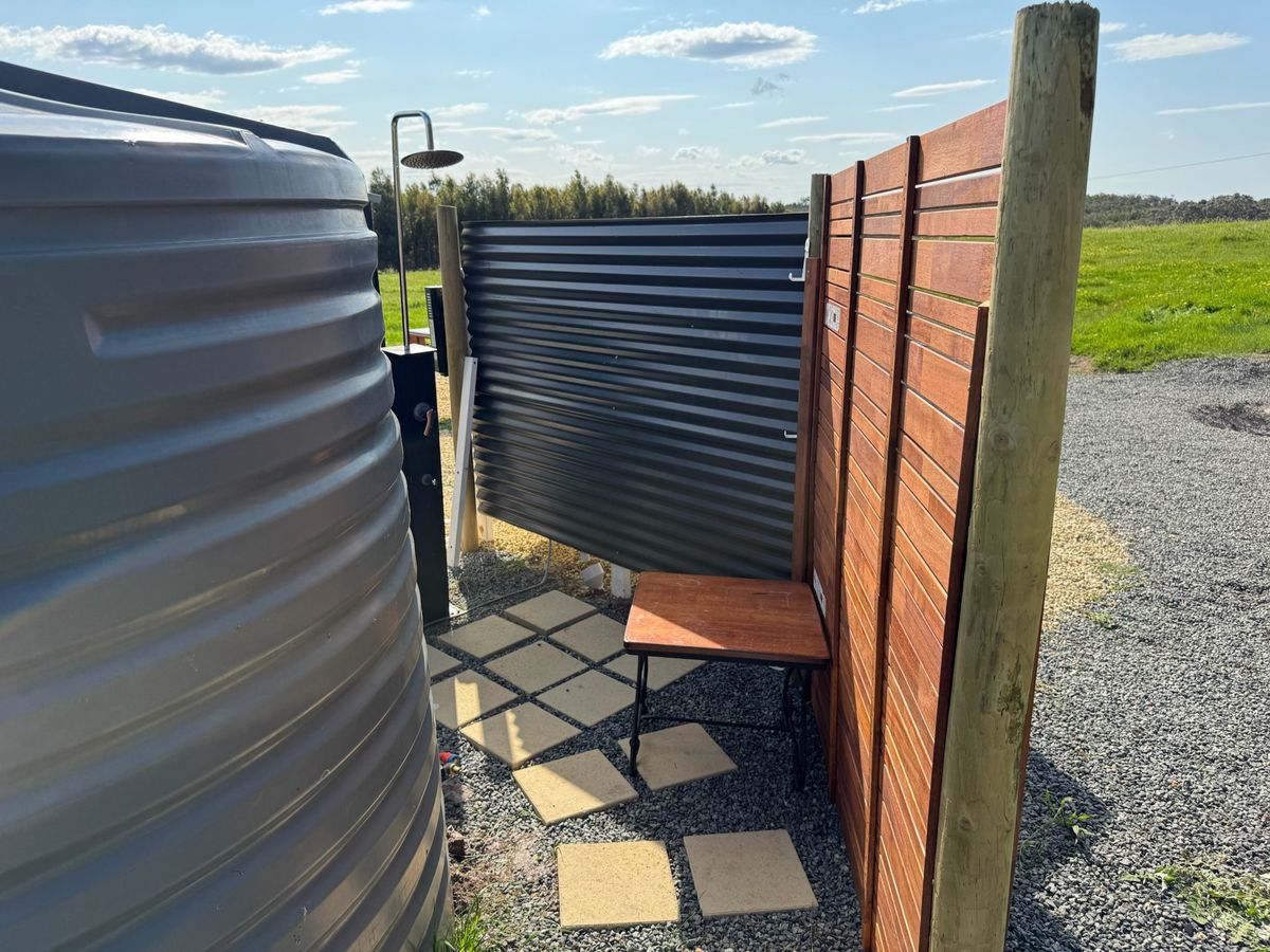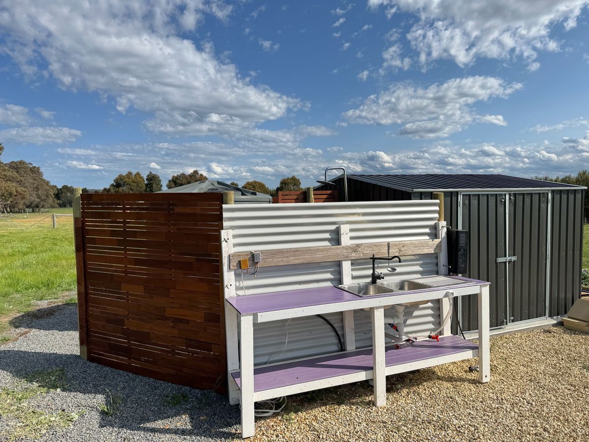 Vendor has created a cosy and functional Glamping Retreat which includes the following items: rainwater tank, 3x3m storage shed(concreted) outdoor screening for the bathroom partitions, 2 x small bathroom tables, outdoor kitchen, bbq, shower, hot water system (camping), pressure water pump, piping and 1548Wh power station battery system (items can be negotiated).